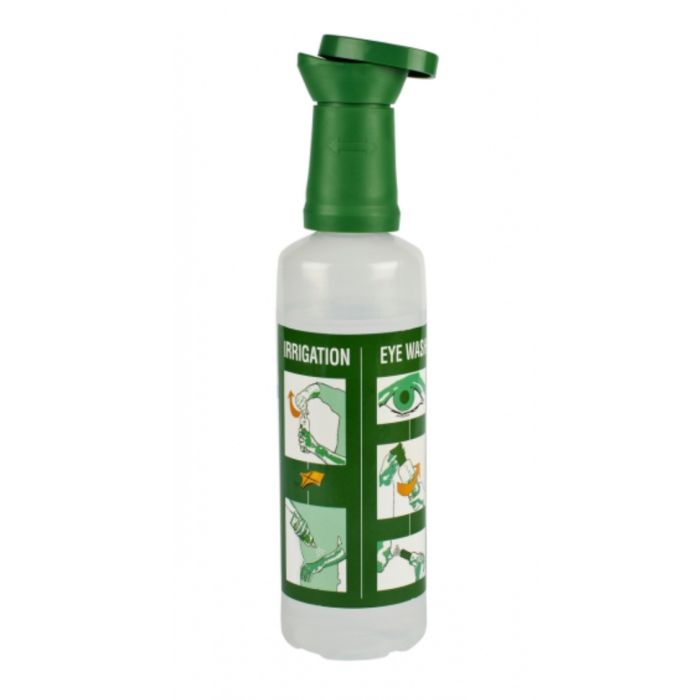 Ögonsköljflaska med 0,5 liter 0,9 % steril natriumklorid.