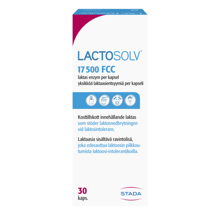 LACTOSOLV® on ravintolisä eikä korvaa tasapainoista ja monipuolista ruokavaliota ja terveitä elintapoja. Suositeltua vuorokausiannosta ei saa ylittää. Ei lasten ulottuville eikä näkyville.