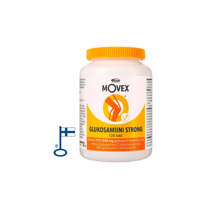 Movex Glukosamiini Strong on vahva ja täysin kasvipohjainen (fermentoitu) glukosamiini-C-vitamiinivalmiste nivelten hyvinvointiin*. Vegaaneille sopiva Avainlippu-tuote. *C-vitamiini edistää normaalia kollageenin muodostumista rustojen normaalia toimintaa varten.