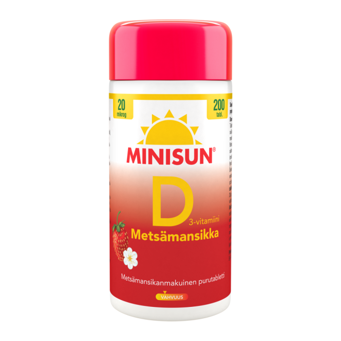 Suomessa kehitetyt Minisun D-vitamiinitabletit ovat helppo tapa varmistaa riittävä D-vitamiinin saanti ympäri vuoden. Minisun 20 mikrog Metsämansikka sisältää tehokkaasti imeytyvää D3-vitamiinia. D-vitamiini vahvistaa vastustuskykyä sekä on tärkeä vitamiini luuston, lihasten ja hampaiden hyvinvoinnille. Annostelu on helppoa. Yksi pieni purutabletti päivässä riittää. Minisun 20 mikrog Metsämansikka on raikkaan kesäisen makuinen ja se sopii nuorille ja aikuisille tehostettuun päivittäiseen käyttöön. Minisun Metsämansikka on helppo pureskella, imeskellä tai niellä. Laktoositon, gluteeniton, hiivaton, soijaton ja liivatteeton.
